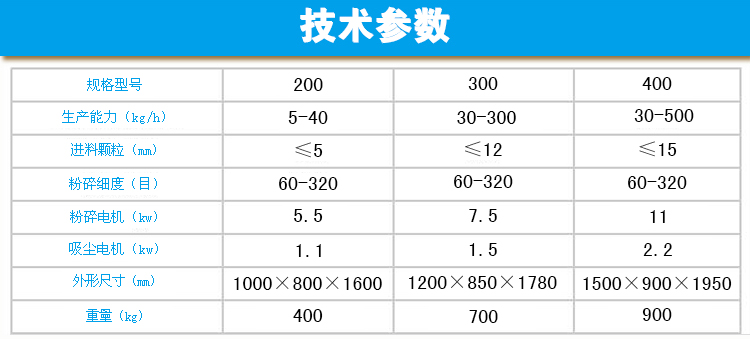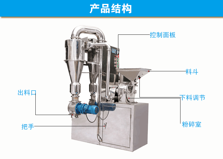 吸尘箱等部分组成,物料由加料斗进入粉碎室,通过高速旋转的刀片进行粉碎,调节分级轮与分级盘的距离来达