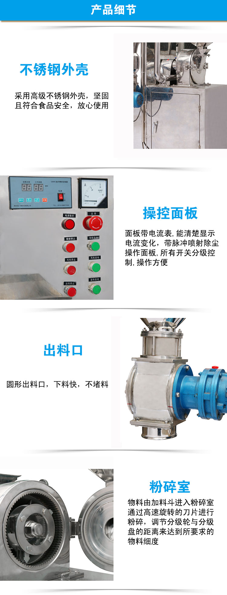 结构简单,操作清理方便,噪音小,产量高,机器全部用优质不锈钢材料制造,粉碎过程中无粉尘飞扬。